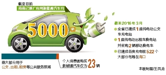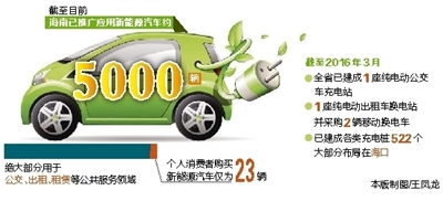 “截至目前,海南已推广应用新能源汽车约5000辆。”省工信厅高技术与低碳制造产业处负责人告诉记者,“十二五”期间,海口作为我国新能源汽车示范试点城市,积极推广应用新能源汽车。截至2016年3月,全省已建成1座纯电动公交车充电站,1座纯电动出租车换电站,并采购2辆移动换电车;已建成各类充电桩522个,大部分布局在海口市。