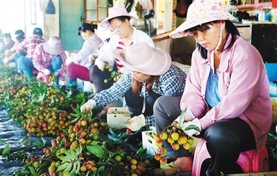 5月26日上午,惠丰果园一派繁忙景象,50多个采摘工天刚放亮就进入果园采摘荔枝。9时多,十多辆农用三轮车开始在果园里奔跑,把采摘下来的荔枝一车又一车运到果园临时搭起的处理场,20多个分拣工一字排开,把大果小果进行分级处理,7个装卸工忙着把分级好的荔枝打包,搬到路边的货车上。