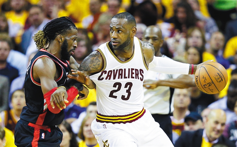 北京时间5月26日,在NBA季后赛东部决赛第五场比赛中,骑士队以116:78战胜猛龙队,总比分3:2领先。图为猛龙队球员卡罗尔防守骑士队球员詹姆斯(右)。 新华社发