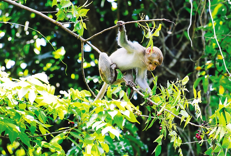5月26日,野生猕猴在三亚亚龙湾热带天堂森林旅游区里采食野果。
