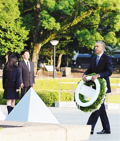 当天下午,奥巴马在出席七国集团峰会后飞赴广岛,并在日本首相安倍晋三陪同下参观了广岛和平纪念公园内的资料馆。随后,奥巴马和安倍先后向慰灵碑献上花圈,但奥巴马并未鞠躬。