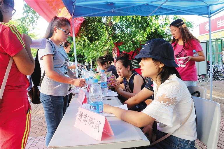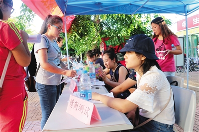 5月25日16:30—19:10,海南师范大学桂林洋校区的食堂门前十分热闹,这一天是全国大学生心理健康日,师大心理健康教育与咨询中心在这里举办了“5.25我爱我”大学生户外心理测评活动。