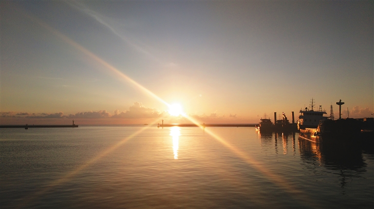 王虎在投稿来信中说,在三沙工作的一天傍晚,结束了一天的工作,独自一人散步至永兴综合码头,热浪还未退去,斜阳西下,放出万丈金光,此刻的南海港湾微波不兴,静谧温柔,几艘海轮静静地靠在码头,蓝海、云层、斜阳、港湾、海轮和谐共处,美丽醉人。“图片所表现的就是傍晚三沙码头静谧安详的氛围。”王虎表示。