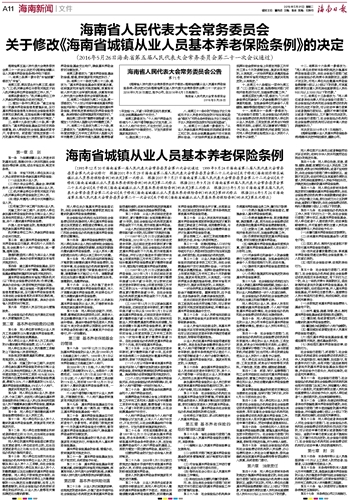 海南省人民代表大会常务委员会 关于修改《海南省城镇从业人员基本养老保险条例》的决定
