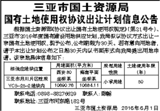 三亚市国土资源局国有土地使用权协议出让计划信息公告