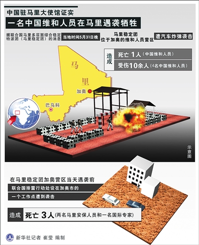 联合国马里多层面综合稳定特派团(马里稳定团)6月1日发布新闻公告说,马里稳定团位于加奥的维和人员营区5月31日晚遭汽车炸弹袭击,造成一名维和人员死亡、10余人受伤。但公告并未透露伤亡人员的具体国籍。