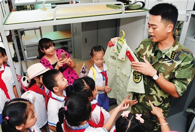 6月1日,海口市第二十五小学海甸校区60余名师生来到海南海警一支队,“零距离”体验警营生活。活动中,海警官兵带领孩子们先后参观了海警舰艇以及影视厅、休闲吧等文化场所,并精心准备了队列和擒敌拳术表演,使孩子们大开眼界。图为“兵叔叔”正为孩子们教授军服的叠法。本报记者 张茂 通讯员 符伟潼 摄