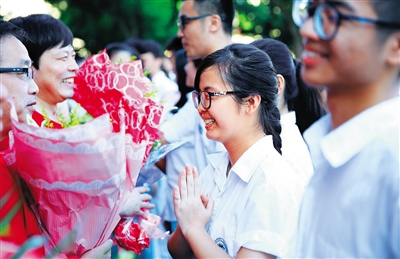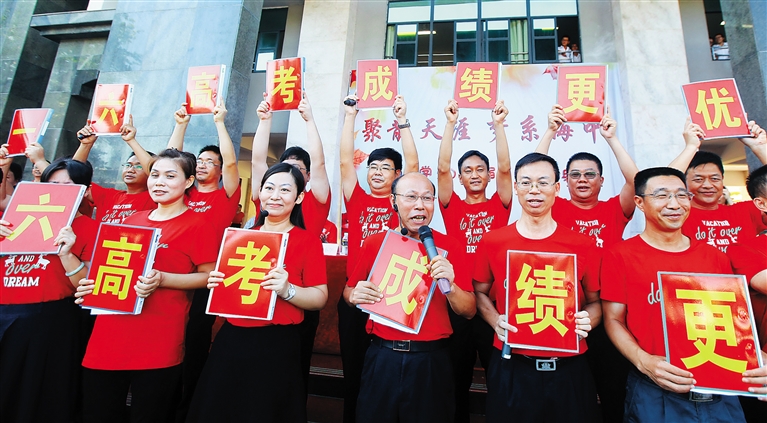 因距离2016年高考不到一周时间,海中高三年级全体班主任特意身着象征喜庆和祝福的红色T恤走上台,为这些即将参加高考的学生朗诵诗歌,用饱含深情的诗歌祝福学生们高考顺利(图左)。本报记者 张茂 摄