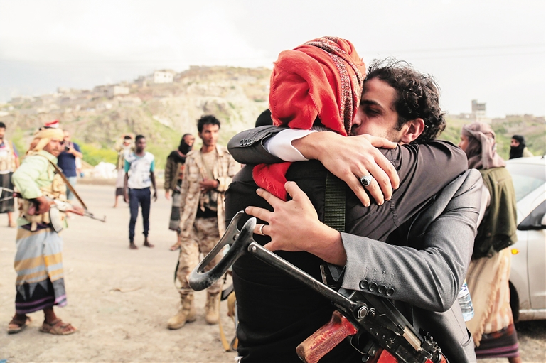 6月1日,在也门西南部的塔伊兹,一名也门政府军战士拥抱归来的战友。 也门政府军发言人当天说,在红十字国际委员会的见证下,也门政府军与胡塞武装和萨利赫联盟当天在处于交战状态的塔伊兹市交换了35名战俘。 新华社/法新