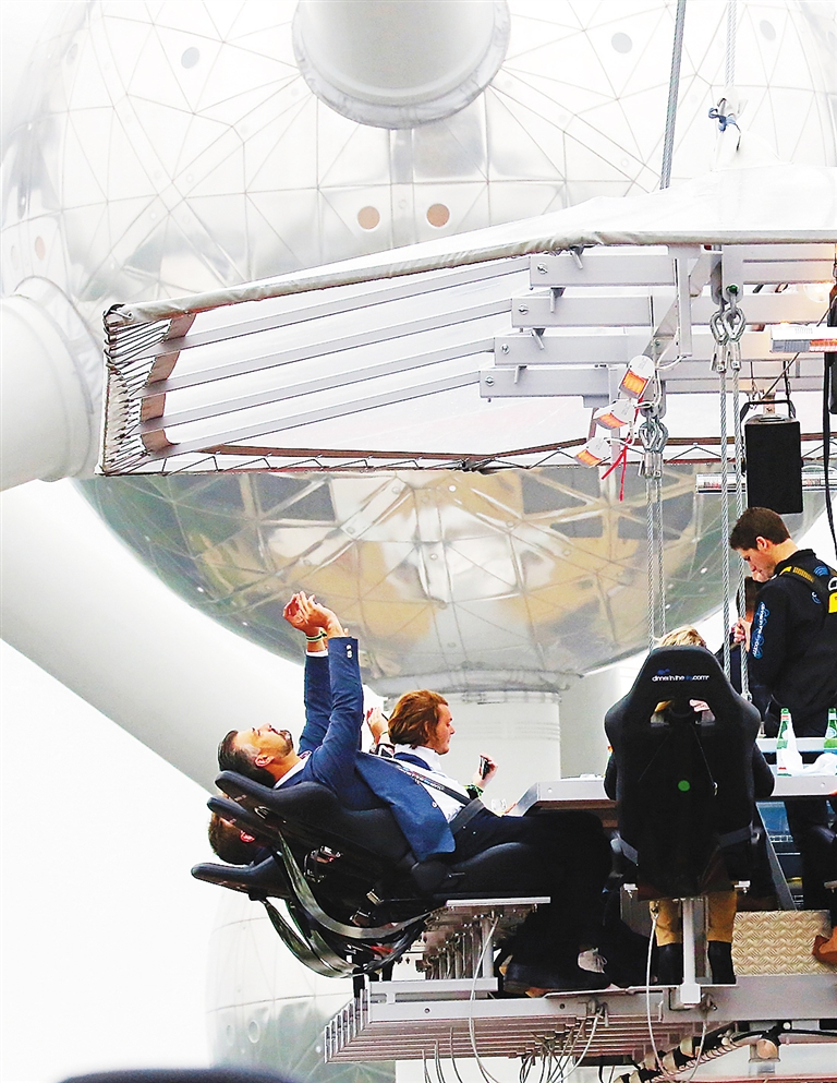 6月1日,在比利时首都布鲁塞尔的地标性建筑原子球前,一名在“空中餐厅”就餐的顾客自拍留念。 “空中餐厅”2006年诞生于两位比利时企业家的奇思妙想和合力创作,10年来已经在包括中国在内的全球40多个国家和地区巡回举办过。一般情况下,“空中餐厅”每次只有1张餐桌。为庆祝活动举办10周年,本次“空中餐厅”同时提供了10张餐桌,可同时接待220名顾客在50米的高空中就餐。 新华社记者 龚兵 摄