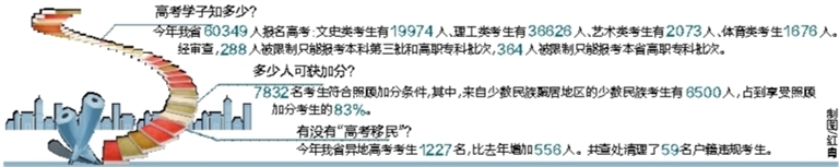另据悉,今年全省共有7948名考生申请享受照顾加分,比去年减少了483人。经省教育厅、省民宗委、省台办、省侨办等部门对各类照顾加分资格的审查,共有7832名考生符合照顾加分条件,相关名单已在省考试局网站上公示并接受考生和社会监督。
