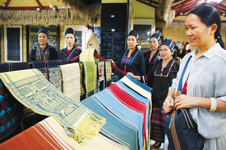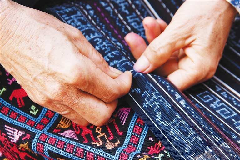 在东方市黎锦传承展示馆,海南日报记者望着一双双饱含沧桑的手,上面还残留着染制棉线时未能洗净的染料痕迹,有的甚至还有上山寻找野板栗树皮和苏木染料途中受伤留下的伤口。
