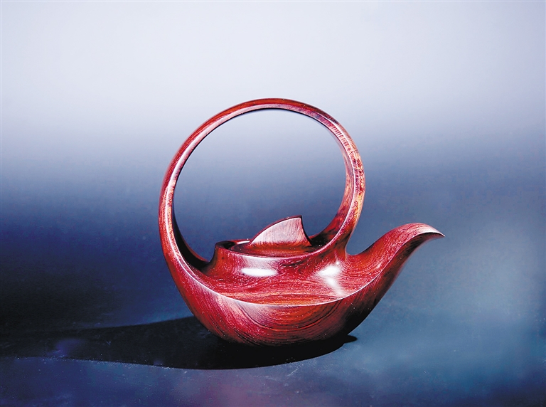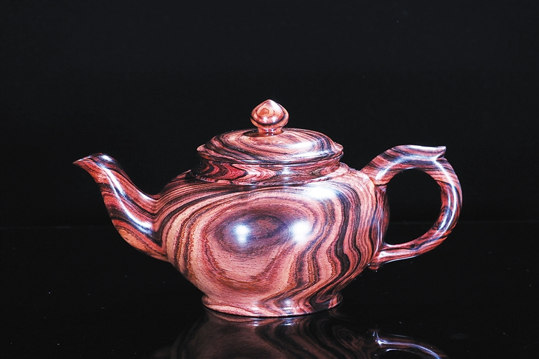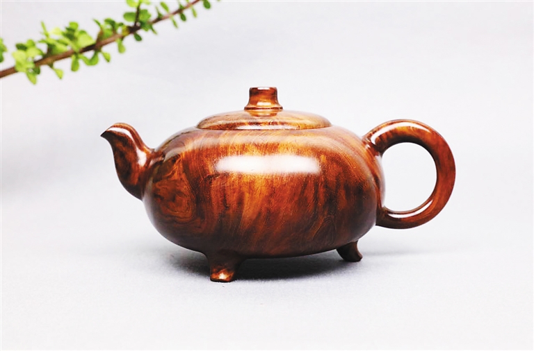 都说“眼缘”很重要。周凤炎至今还记得自己第一次见到海南黄花梨时受到的震撼:“那花纹、那香气,透着一股特别尊贵的气质,就连刨下来的木屑都与寻常木头不同!”他被深深地吸引了,尽管那时“海黄”工艺品起步还没有几年,所谓制壶也不过是简单地切出一个茶壶的形状,他还是“赖”在制壶的手艺人身边挪不动步子。