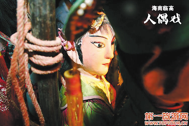 傍晚,暮色清凉,日光隐退,远处可见绚烂的落日晚霞,近处逐渐亮起万家灯火,临高北部海湾边上的一个村庄里,老人孩子个个脸上洋溢着快乐的笑容,纷纷朝着有一座戏台的文化广场走去。那里,灵活的木偶人在台上不断舞动着,台下熙熙攘攘,有人沉醉在人偶戏一波三折的故事情节中,有人则对那惟妙惟肖的木偶充满了兴趣。