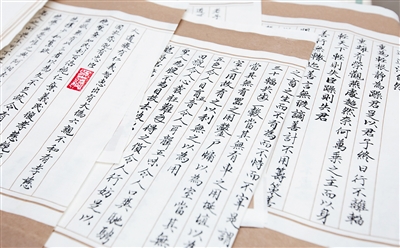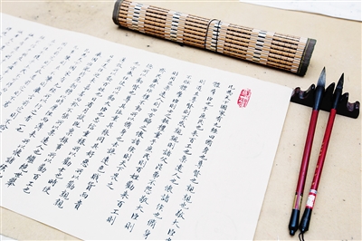 “练字我个人建议从篆书开始,因为可以锻炼线条的临摹能力。在所有字体里面,小楷是最难的。因为书写的力度和线条很难把握,但也是我最喜欢的。”这些年里,张筑把隶书、楷书、行书、草书都练了一遍,现在每样都写得很好。记者来到张筑家时,她正坐在书桌前,在宣纸上用小楷一笔一划地誊写《中庸》。她的字体气韵生动、行间玉润、笔圆带方、一气呵成。书桌前还放着读经机,机器里缓缓传来《论语》《大学》《中庸》《千字文》的诵读声,让整个房间显得宁静而安详。