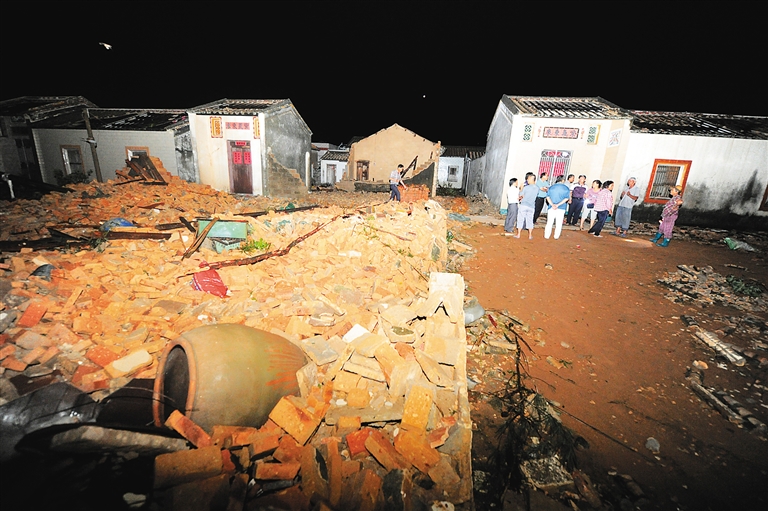 过了短短3分钟左右,破坏力强大的龙卷风消失在湖山水库上空。待村民从屋中出来,熟悉的村庄已面目全非:直径35厘米的椰子树拦腰折断,60年树龄的木麻黄连根拔起,靠近水库一侧的村道已经被倒塌的树木全部封死,两吨多重的农用车被掀翻在路旁,数间瓦房倒塌、遍地瓦砾。