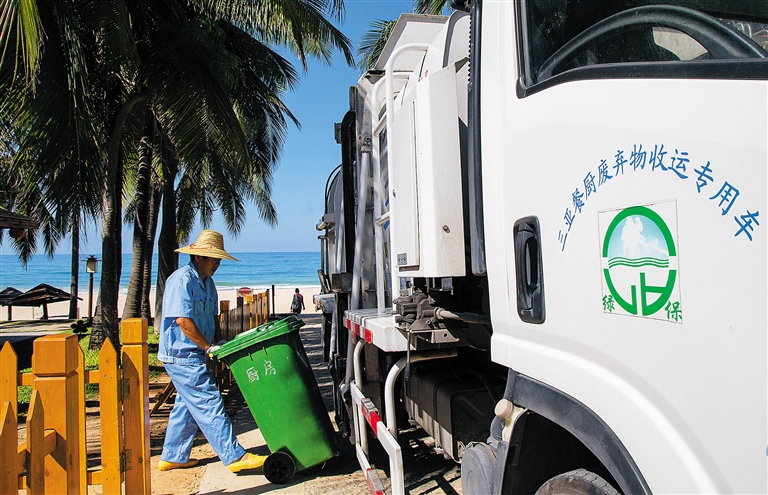 据悉,三亚市餐厨废弃物处理项目是国家餐厨废弃物无害化处理和资源化利用首批试点项目。为推进餐厨废弃物统一收运工作,三亚选取了部分接待旅游团队用餐单位、海鲜排档等餐饮单位开展试点工作。目前,全市共有150多家餐饮企业正式开展收运工作。下一步,三亚将加大推进力度,力争在今年底全面实现餐厨垃圾资源化利用和无害化处理。图为6月2日,三亚餐厨废弃物收运专用车在大东海餐饮店旁收运餐厨垃圾。本报记者 武威 摄