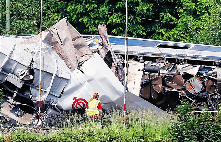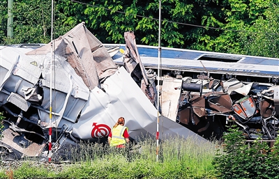 6月6日,在比利时默兹河畔圣乔治镇,工作人员在火车追尾事故现场查看情况。 据当地媒体6日报道,当地时间5日23时15分左右,一辆从比利时那慕尔市开往列日市的客运列车行驶到默兹河畔圣乔治镇时,与前方行驶的货运列车发生追尾。事故目前已造成至少3人死亡、40人受伤。 新华社/路透
