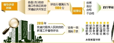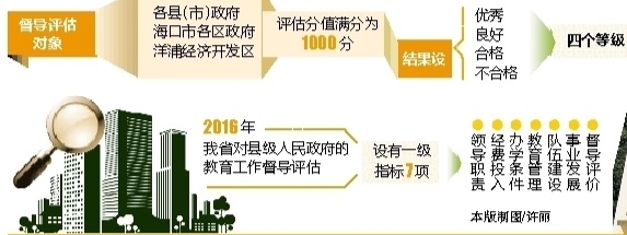 省政府决定2016年开展第三轮县级人民政府教育工作督导评估,督导评估对象为各县(市)政府、海口市各区政府和洋浦经济开发区。评估分值满分为1000分,结果设“优秀”、“良好”、“合格”、“不合格”四个等级。