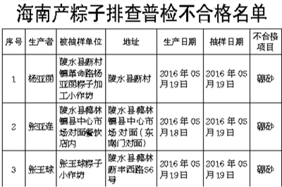 2016年5月19日,为确保端午节的节令食品粽子食品安全,查处、打击非法添加硼砂、用含黄曲霉毒素B1陈化糯米加工制作粽子的违法行为,全省各级食品药品监督管理局、监管所采取全覆盖突击检查、不遗漏一个生产加工厂和作坊,在同一时间统一开展粽子全面排查普检。经过对全省462家粽子生产企业和小作坊的粽子进行硼砂、黄曲霉毒素B1快速检验,发现4家小作坊粽子产品可疑,经实验室最终检验确定3家小作坊制作的粽子中含有硼砂。不合格粽子已在抽检时被查封,禁止流入市场,有关市县食品药品监管局已对3家小作坊立案调查,涉嫌犯罪的已移送公安部门追究刑事责任。同时,在全省范围内随机抽取了18批粽子样品,按照国家食品安全标准进行重金属、苯甲酸钠等防腐剂、沙门氏菌等致病菌全项目检验,结果为100%合格。拉网排查及抽检结果均表明,海南省生产的粽子总体是安全的,消费者可以放心选购。 食品安全是关系全民身体健康的、不能慢作为的特殊事业。海南省食品药品监督管理局将以“早一天消灭有毒有害食品药品,公众健康就少受一分危害”的使命感,继续亮剑,经常性组织全省排查普检,严厉打击制售有毒有害食品的违法犯罪行为,保障公众健康不再受各类含致癌物质食品的伤害。同时,也提醒全省各餐馆、食堂、食品经销商不要购进、销售添加有毒有害物质的食品,违者将按销售有毒有害食品罪被追究刑事责任。对不构成犯罪的,也将按《食品安全法》最高处予货值金额三十倍罚款,吊销许可证,并最高处十五日拘留。食品经销商和消费者一旦发现夏季常温下放置两天不变味、不变质的非抽真空包装粽子,立即拔打12331向海南省食药监管局举报,一经查实,最高可获50万元奖励。