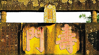 如今可见的牌坊,正中刻有“寿门”,背面刻“齿德兼隆”,均涂彩色油漆,黄底红字,虽色泽脱落,字迹却清晰可辨。坊体采用单间四柱结构,每柱前后各有一条纹边风掌,石柱上刻有一些文字,历经岁月的冲刷打磨,字迹已不是那么明显,需靠近仔细辨读方可揣测出大意来。内容包括:修建牌坊的官员职位和名称,如“太子少保兵部尚书兼都察院右都御史总督广东广西等处地方军务兼理粮饷”等,以及修建牌坊的时间,如“嘉庆丁卯年孟夏月吉旦”等字样。两旁刻有《懿行录》全文和“同光日月”、“配老清宁”八个大字。