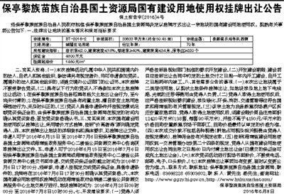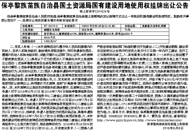 保亭黎族苗族自治县国土资源局国有建设用地使用权挂牌出让公告