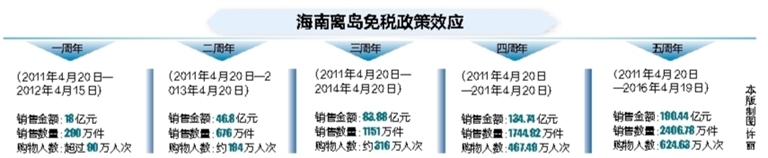 自2011年4月20日,离岛免税政策正式在海南落地实施,这项政策早已成为国际旅游岛一张熠熠生辉的“金名片”。据海口海关统计,政策实施5年来,三亚、海口两家免税店累计销售额190.38亿元,购物2405.97万件,购物人数624.58万人次,有效拉动了海南旅游转型升级。