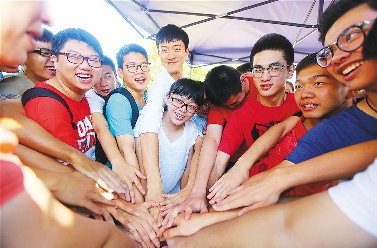 6月7日, 在海南中学初中部考点,老师和学生合掌鼓劲,预祝高考顺利。