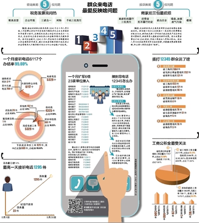 据统计,5月1日至5月31日,省政府综合服务热线12345共接听群众来电6117个,其中无效电话788个,有效电话5329个,形成的5329件有效工单中,省工商局工单总量为2517件,占总比47.23%;接待现场投诉3件。话务量最高时为5月30日,当天接听热线1295件,平均一分钟一个电话。