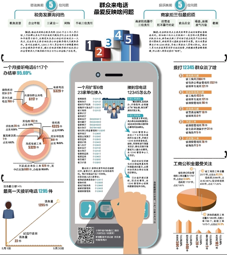 5月伊始,省政府综合服务热线12345平台试运行初期,仅有省烟草专卖局、省商务厅、省知识产权局、省海洋和渔业厅4家单位的服务热线并入。截至5月31日,又有省工商局、省审计厅、省民政厅、省林业厅、省住建厅、省教育厅、省水务厅、省住房公积金管理局、省环保厅、省国土资源厅、省安监局、省统计局、省人社厅、省农业厅、省文体厅、省食药监局、省质监局、省交通厅、省卫计委等19家单位接入。