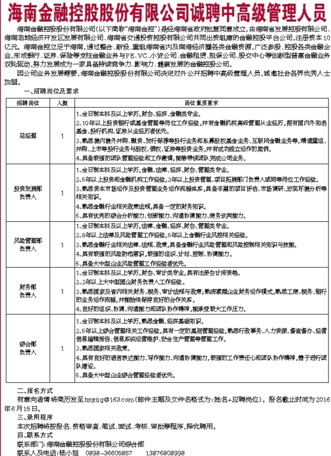 海南金融控股股份有限公司诚聘中高级管理人员