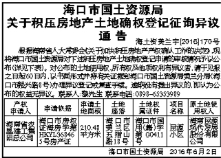 海口市国土资源局关于积压房地产土地确权登记征询异议通告