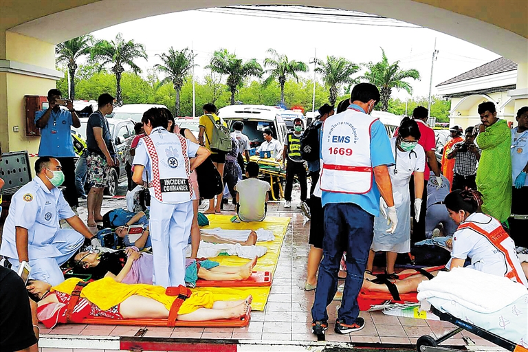 泰国旅游胜地普吉岛附近海域8日下午发生快艇相撞事故。中国驻泰国宋卡总领事馆确认,至少两名中国游客在事故中遇难,另有30余名中国游客受伤。事发两艘快艇分别搭载36名中国游客和24名中国游客。30余名伤者已被送往附近医院接受救治,其中3人伤势严重。泰国警方称,8日上午,普吉当地下起暴雨。下午事发时,海上风浪较大,或致事故发生。新华社发