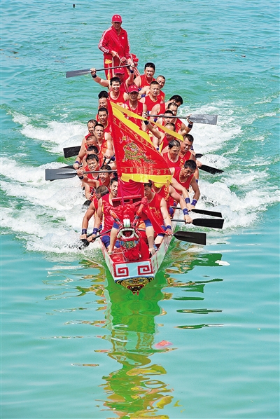 6月9日,在福建连江,筱埕镇定海村村民参加海上龙舟比赛。 当日是端午节假期第一天,多地举办龙舟比赛,用这种传统方式迎接端午节。 新华社发
