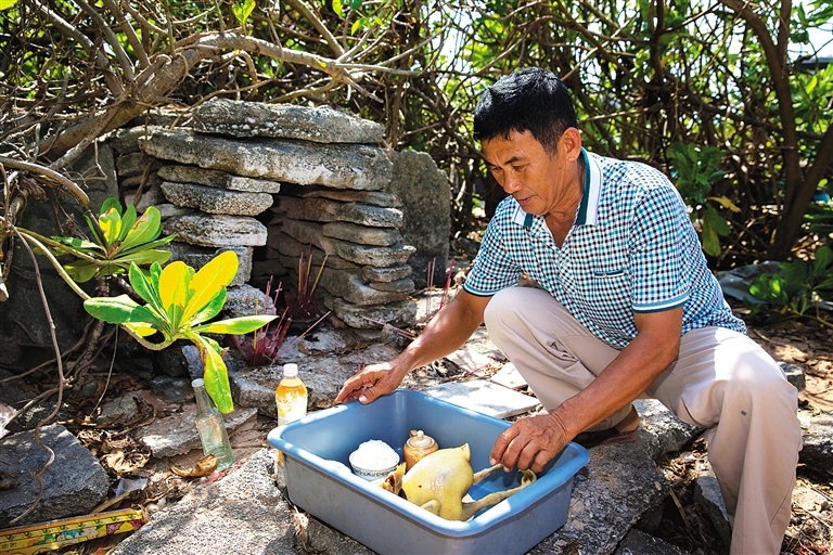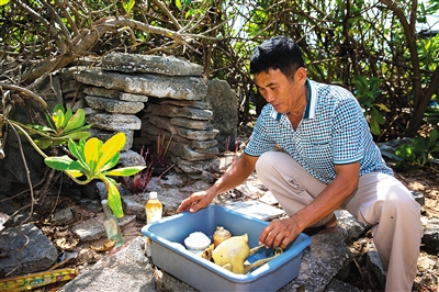 “以前听阿公说,每当渔船行驶到南海一个岛礁上,渔民们都会搭一个简易的‘兄弟公’的庙,祭拜一番再走,以求接下来的航路一帆风顺。”麦运秀还清楚地记得祖父对他描述的南沙岛礁上的那些小庙宇:当时受条件限制,那些岛上连黏土都很难找到,渔民们只能用捡到的石头简单搭一个兄弟庙。潭门老渔民卢业发双手呈垂直状,比划出一个半框形,他说心中有“兄弟公”,不管兄弟庙如何简陋,都能显示自己的诚意。
