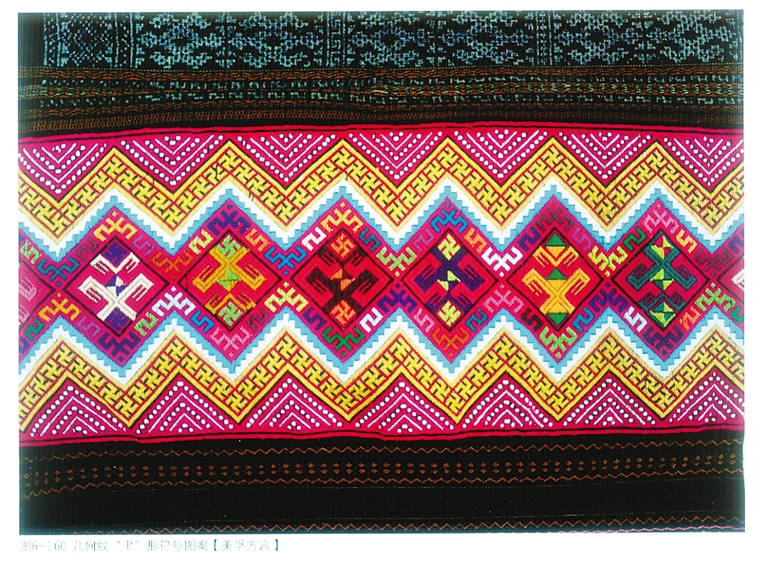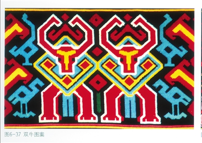 辨识价值,黎锦图案组合也很有讲究。形的不同组合,是织锦图案发展变化的关键环节。比如,哈方言地区筒裙的牛纹图案,就很好地处理了物象之间关系。牛是黎族社会的主要生产力,也是家庭财富的象征,黎族人非常重视和崇拜牛。