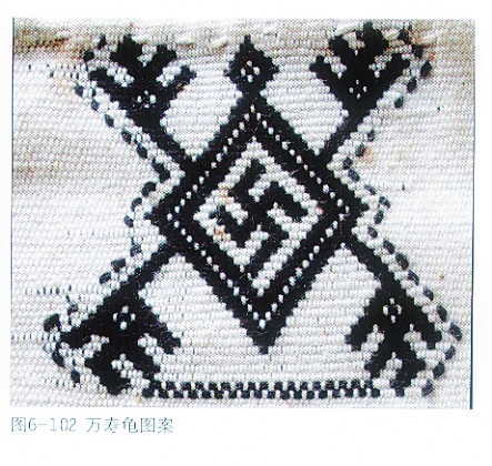 在符号文化中,我们要再次提到“卍”字纹。它作为织锦艺术装饰上的主题花纹图案,新婚夫妻的被褥面子上有卍卍卍卍卍形,此种连体花纹寓意吉利,称为“万字绵延无尽头”。此外,受汉族的影响,一些黎锦中也能够看到“喜”、“寿”、“福”、“贵”等汉字,可见民族文化的交融。