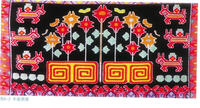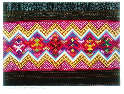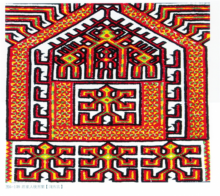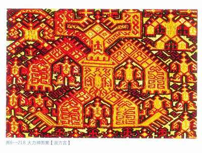 “大力神”人纹图案 润方言地区妇女服饰的主体装饰图案,图案细腻、色彩艳丽、形态夸张抽象,寓意本民族向着文明、康宁、繁衍生息、长久万代。