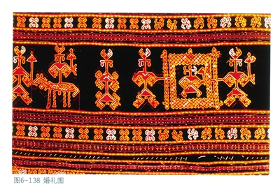 婚礼图案 主要以黑色为底,配上红、黄作为图案纹样装饰主色,黑色象征庄重、永久、吉祥和辟邪,红色则表示吉利、喜庆、威严,黄色表示华丽、健美、权贵富有。婚礼图主体纹饰和鲜明的色彩相互映衬,显得简洁纯朴,给人以古典美。