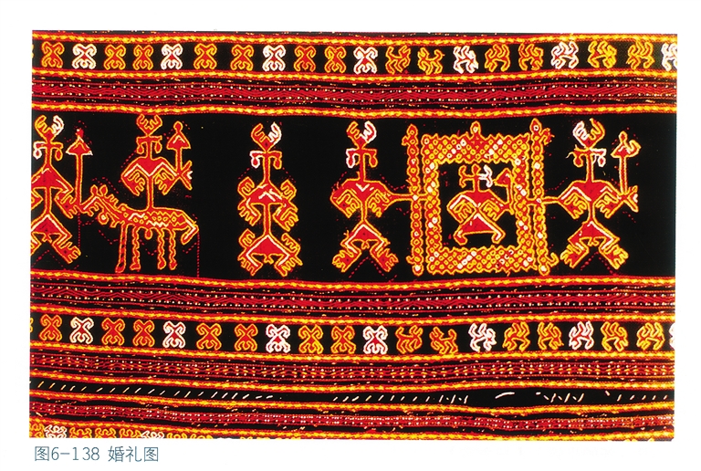 织锦的婚礼图,主要以黑色为底,配上红、黄作为图案纹样装饰主色,黑色象征庄重、永久、吉祥和辟邪,红色则表示吉利、喜庆、威严,黄色表示华丽、健美、权贵富有。婚礼图主体纹饰和鲜明的色彩相互映衬,显得简洁纯朴,给人以古典美。