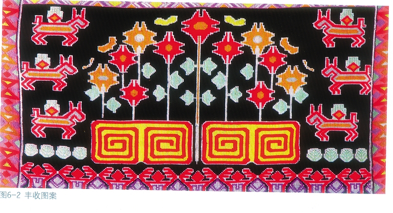 人舞图案 画面是盛装的青年男女携手并肩,纵情欢跳,气氛热烈,体现了黎族是个能歌善舞的民族。