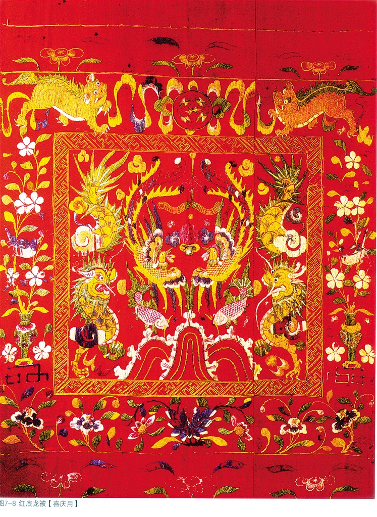 织锦龙被所选用的原料是一个漫长的发展过程,有明显的阶段性,反映出黎族纺织技艺的不断改进,也说明黎族文化是在吸收外来文化中成长起来的,这一点,反映在龙被题材上十分明显。比如,早期的龙被,黎族文化特色浓重,晚期龙被,则深受汉族艺术的影响。