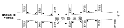 海秀快速路西起长滨路,沿海盛路与海秀路至侨中路后穿过侨中村达南沙路、上跨南大桥,于国兴大道落地,全长14.3公里, 工程全线采用“主线+辅道”型式,设计车速为80公里/小时,全线共设置10对平行匝道与地面连接,建设一座龙昆立交,同时完善丘海立交。其中主线北侧出入口5出5进,南侧出入口5出5进,以满足地面交通与高架主线的沟通需求。