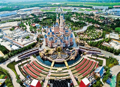 这是6月13日航拍的上海迪士尼开幕庆典主会场。 从6月14日开始,上海迪士尼乐园将举行为期三天的开幕庆典。日前,开幕庆典主会场“奇幻童话城堡”前金色的舞台和观众席已搭设完成。 新华社发(钮一新 摄)