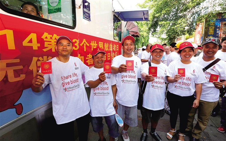 今天,省血液中心开展“金奖献血者徒步无偿献血宣传”活动,50名历年的全国无偿献血奉献奖金奖的获得者参加了此次活动。他们身着统一的志愿者服装,手拿无偿献血宣传举牌,分别经蓝天路和大同路步行至博爱南步行街,沿途发放无偿献血宣传资料,为过往路人宣传无偿献血知识。