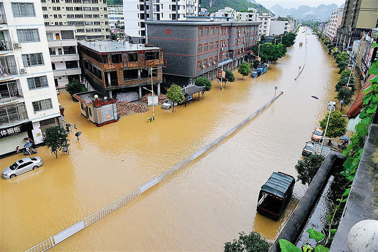 6月15日,广西河池市罗城县城区街道出现内涝。 当日,广西河池市罗城仫佬族自治县遭遇新一轮强降雨袭击,县城多处出现内涝,多个乡镇受灾。 新华社发(廖光福 摄)