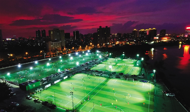 6月15日傍晚,海口市府城滨江路上的足球场,人们通过踢足球的方式,感受着夜海口的速度与激情,也增加了海口的城市活力和魅力。本报记者 张杰 摄
