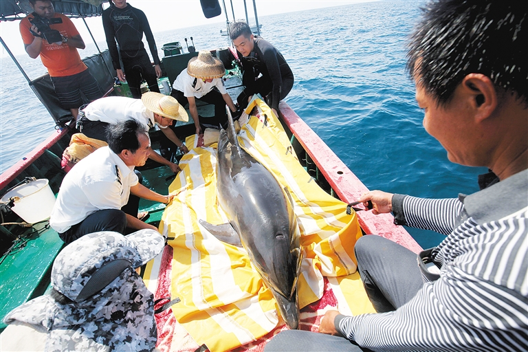今天,万宁乌场港海域,省渔业部门和省南海水生野生动物救护中心的工作人员将一只受伤痊愈的海豚放归大海。4月11日,这条大约6岁的南宽吻海豚被当地渔民发现后由渔业部门暂时养在渔排进行救护。经过技术人员两个多月的精心治疗,目前完全恢复健康。
