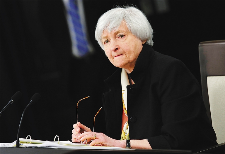 6月15日,在美国首都华盛顿,美联储主席耶伦出席新闻发布会。 美国联邦储备委员会当日宣布将联邦基金利率维持在0.25%至0.5%不变,同时表示将继续密切关注通胀指标及全球经济和金融形势。 新华社/法新