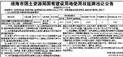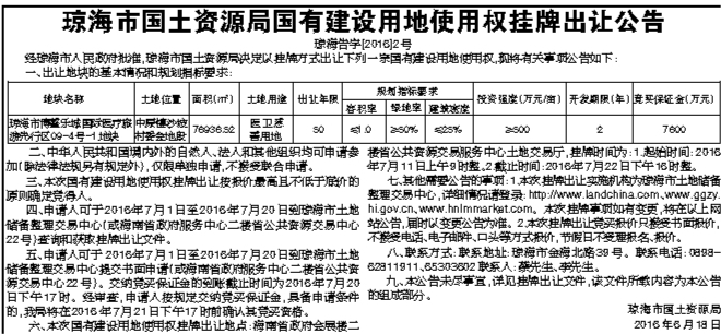 琼海市国土资源局国有建设用地使用权挂牌出让公告